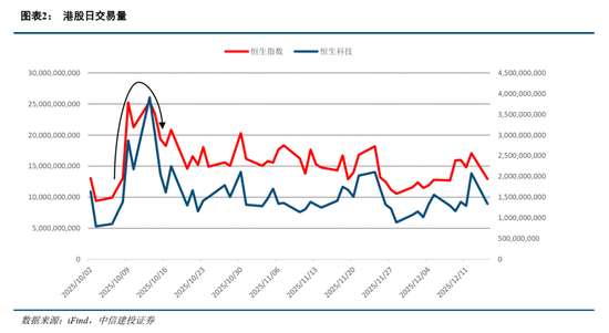 2025年10月9日,中国商务部宣布进一步扩大稀土相关物项的出口管制范围。次日,特朗普重启对华关税威胁。中美在稀土这一战略性资源领域的同时动作,被市场视为紧张关系升级的信号,直接触发了避险情绪。短期恐慌情绪导致港股资金外流,机构优先获利了结科技股等9月表现较好的高风险资产,引发以恒生科技为主的指数大幅下跌,交易量增长明显,后大幅下降。10月30日,中美元首釜山会面,双方就多项议题达成共识,涉及延长对等关税暂停期、芬太尼关税和出口管制等方面。关税回到4月2日前原点,中美关系暂时走向稳定,同时港股风险偏好有所回温。