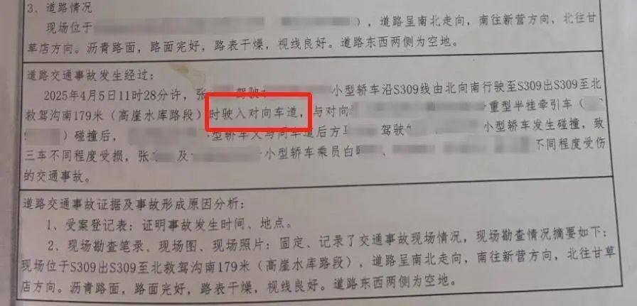 在白女士提供的一份由榆中县公安局交通警察大队出具的道路交通事故认定书中,记者注意到,“张某某驾车驶入左道发生交通事故,其行为违反了《中华人民共和国道路交通安全法》第三十五条‘机动车、非机动车实行右侧通行’,是引发事故的主要原因。”交警部门认定张某某承担事故主要责任,重型半挂牵引车司机承担次要责任,其余人员无责。